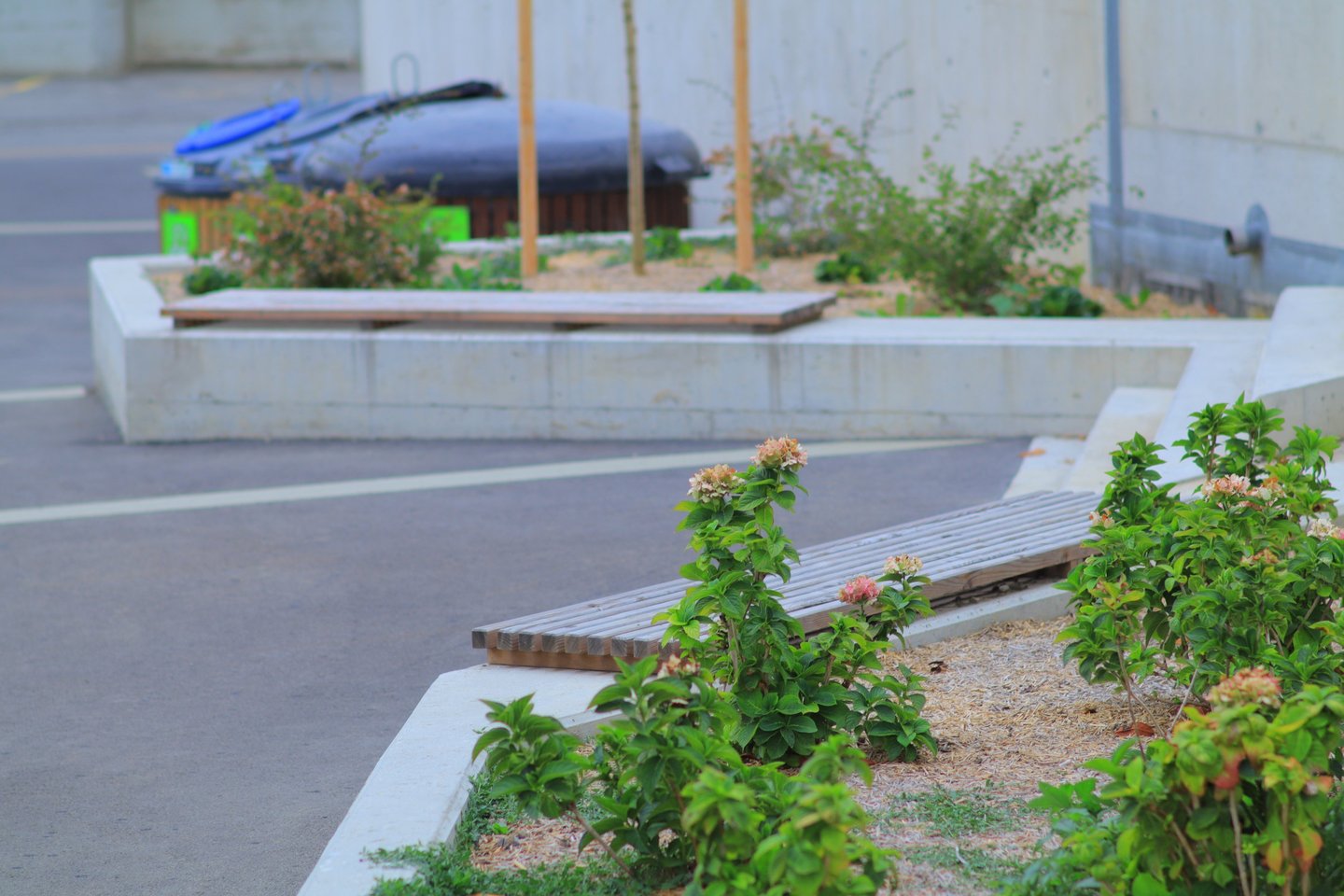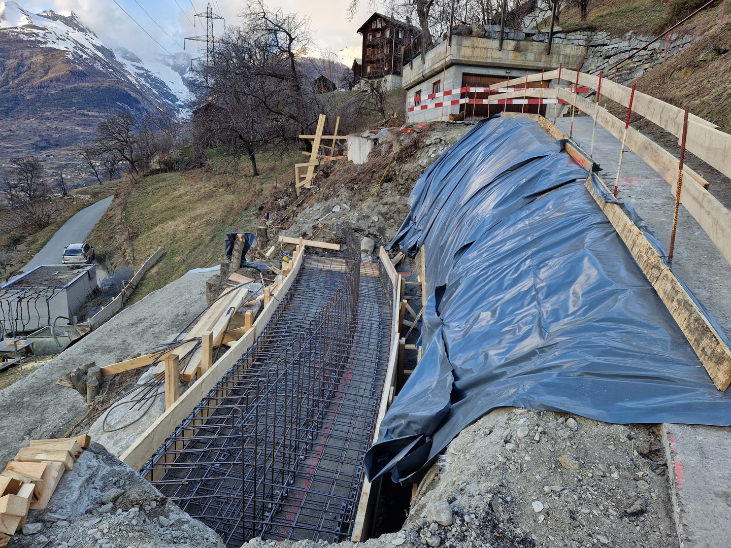 Aménagement extérieur intégrants des sauts de loups et une voie pour piétons et cyclistes, avec un escalier donnant accès à un ensemble résidentiel moderne(Projet Urbana) à proximité de Sion.