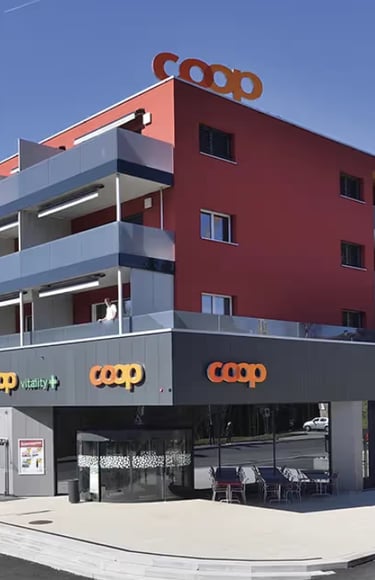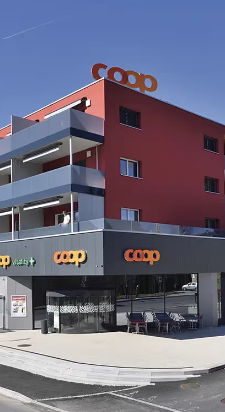 Construction d’un magasin Coop avec structure en béton armé, surfaces commerciales et zones de stockage.